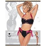 Flocked dot and stretch mesh 2 piece set. Set includes bra top with slightly padded cups, contrasting ribbon across top and bottom, stretch mesh back, hook and eye closure, and halter ribbon straps. Retro-style panty has a lace overlay and satin ribbon bows on the sides. Read more