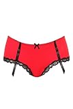 Get a little flirty in these red with black trim garter briefs. Feature black lace trim and elastic waist with matching black adjustable garters. Read more