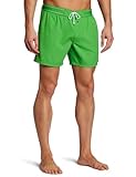 A modern swim trunk with a 14-inch side length, exposed stripe waistband, back pocket logo label