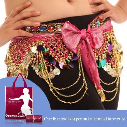 BellyLady Unique Fabric Belly Dance Hip Scarf, Deluxe V-Shape Style Overviews Color: available in rose red. Dimension: Wrap measures 63 inch (160cm) in length, which fits slim to 31.5 inch (80cm) waists. Fabric: velour. Material: gold coins with colorful rhinestones and leaves. Style: unique waves style. Features: The Hip Scarf is made of top quality chiffon, with beautiful noisy gold coins, black and gold beads, imbedded with silver, gold, red and turquoise rhinestones and in addition this hip scarf is accented with iridescent metallic gold, blue, turquoise, pink and red leaves. Beautiful color Egyptian belly dancing hip wraps hand crocheted delicately with multiple rows of beads and coins. Light weight and jingly, this scarf got all coins and beads hand stitched on highest quality chiffon. All beads and coins are hand sewn, not mass produced! This scarf creates loud and lovely sound when the dancers move and shakes hip. Express your inner power and beauty and in our designer belly dancing scarves, as a dancing tool, match with any outfit, shawl, head wrap,etc. This scarf is great for Belly Dancing, Zumba or casually wearing with jeans, skirts, swimwear or with just about anything. Want something a little nicer? Try our wavy-bottom scarves!